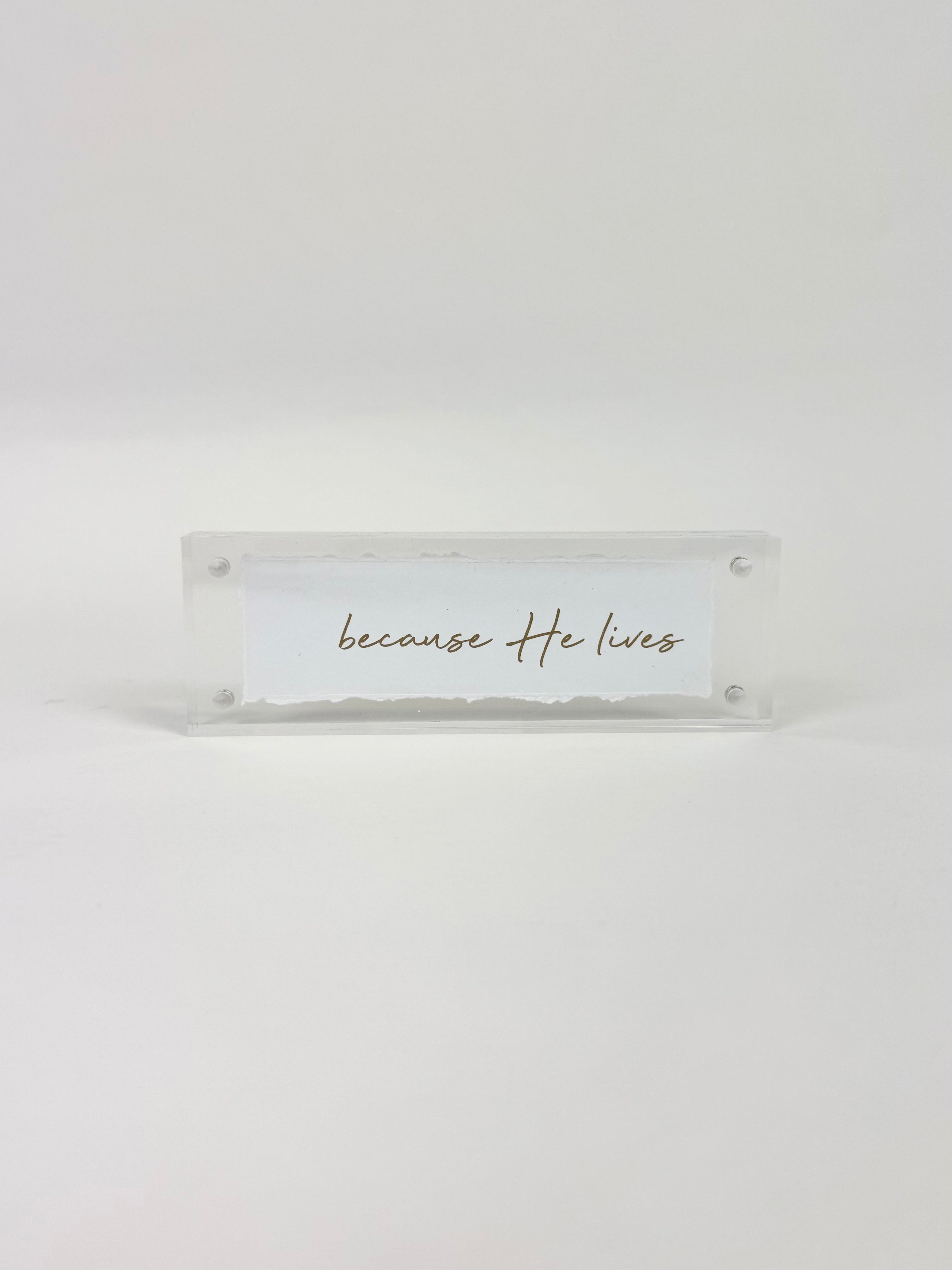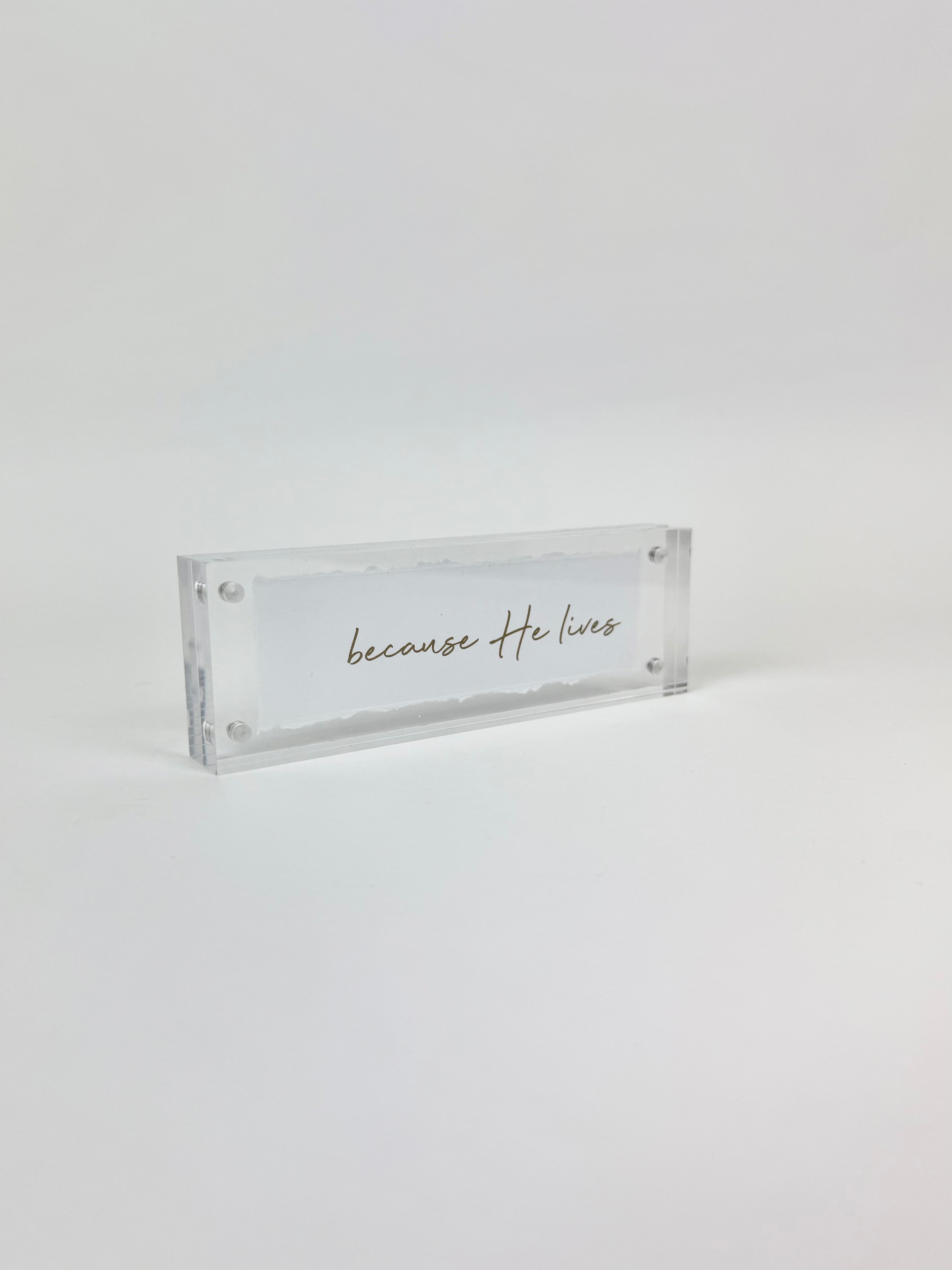 Last stock! Product form Because He Lives Acrylic Frame $32.00 This acrylic frame is a great piece of decor that you can add to your bookshelf or dresser or even... Read more Read more Add to cart This item is a recurring or deferred purchase. By continuing, I agree to the cancellation policy and authorize you to charge my payment method at the prices, frequency and dates listed on this page until my order is fulfilled or I cancel, if permitted.
