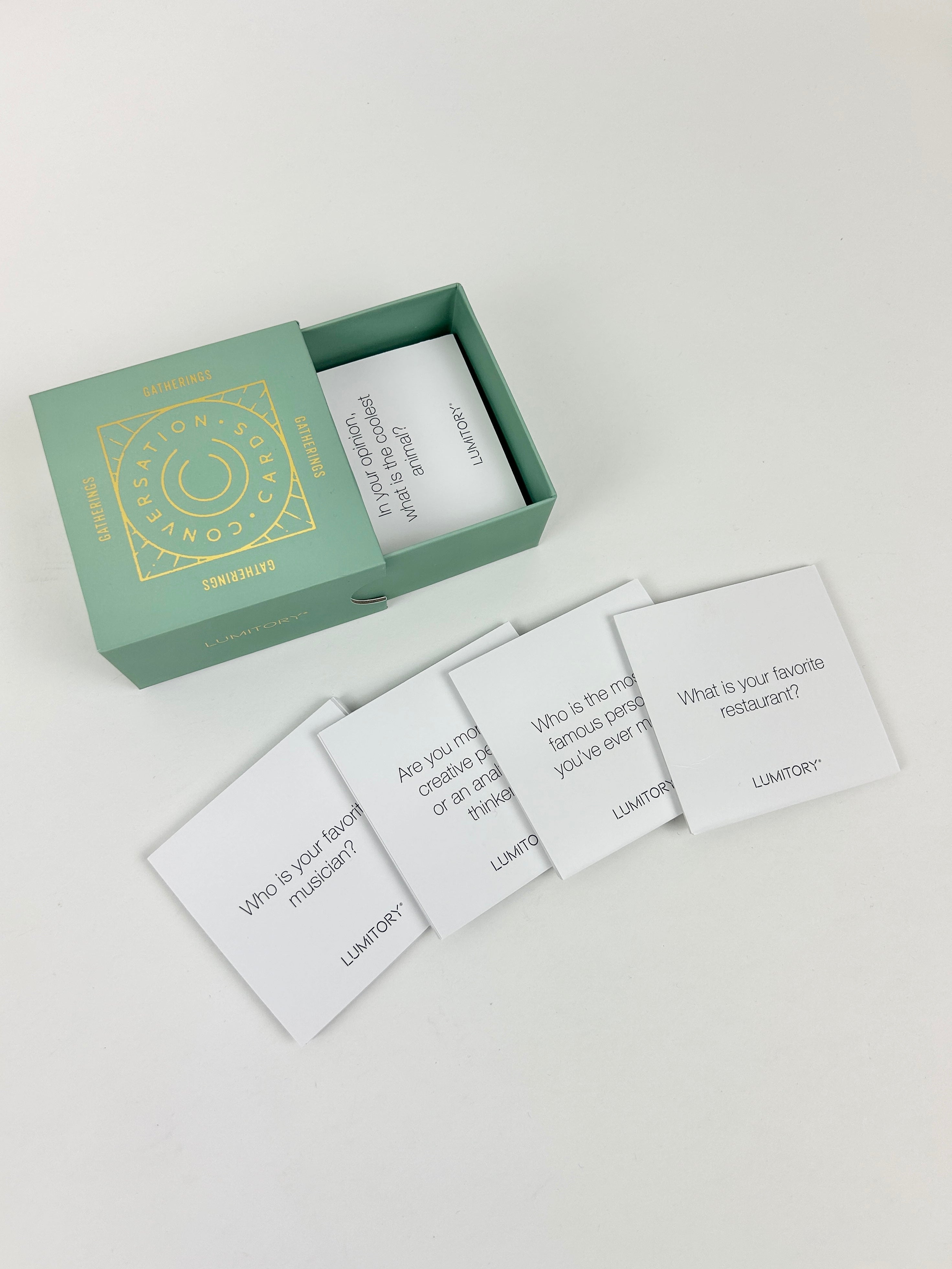 Product form Gatherings Conversation Cards $28.00 This box of conversation cards are perfect for your next family gathering or dinner party! You can use them as... Read more Read more Add to cart This item is a recurring or deferred purchase. By continuing, I agree to the cancellation policy and authorize you to charge my payment method at the prices, frequency and dates listed on this page until my order is fulfilled or I cancel, if permitted.