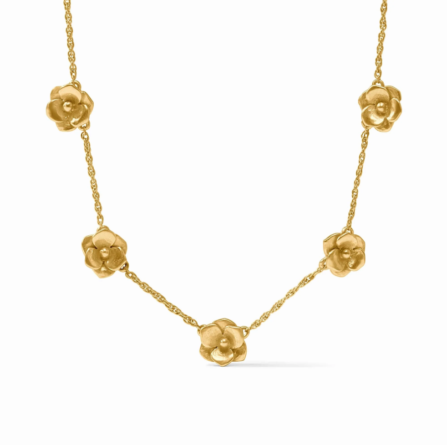 Product form Julie Vos Bloom Delicate Station Necklace $155.00 Product Details 24K gold plate Length: 16.5" - 17.5 inches" (adjustable) Features a lobster clasp Flower pendant measures 1.09" Read more Read more Add to cart This item is a recurring or deferred purchase. By continuing, I agree to the cancellation policy and authorize you to charge my payment method at the prices, frequency and dates listed on this page until my order is fulfilled or I cancel, if permitted.