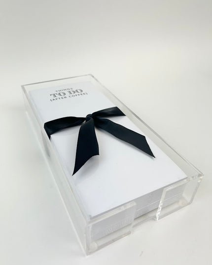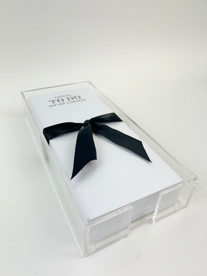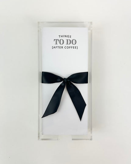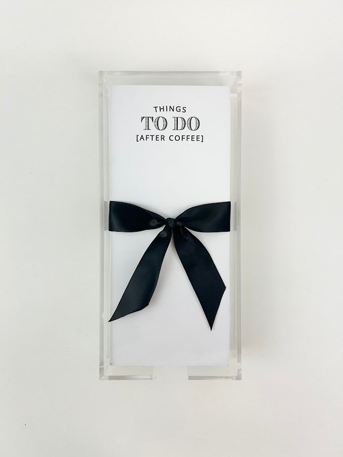 Last stock! Product form Notepad W/ Acrylic Box Things To Do After Coffee $30.00 This acrylic tray and notepad set is a fun addition to your desk at home or at the office! Product... Read more Read more Add to cart This item is a recurring or deferred purchase. By continuing, I agree to the cancellation policy and authorize you to charge my payment method at the prices, frequency and dates listed on this page until my order is fulfilled or I cancel, if permitted.