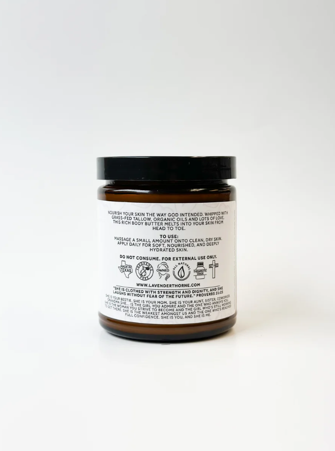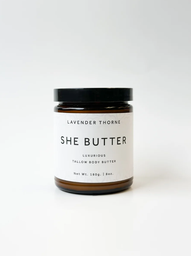 Product form Lavender Thorne SHE Tallow Butter $68.00 This tallow body butter will leave your skin feeling smooth, nourished, and freshly scented! Product Details Size: 8oz Simply massage... Read more Read more Add to cart This item is a recurring or deferred purchase. By continuing, I agree to the cancellation policy and authorize you to charge my payment method at the prices, frequency and dates listed on this page until my order is fulfilled or I cancel, if permitted.